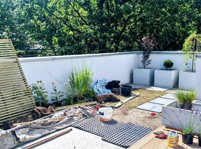 Z pustego dachu powstała zielona oaza. W ciągu dwóch tygodni położyliśmy betonowe płyty tarasowe i maty rozchodnikowe. Poszerzona została przestrzeń tarasowa z deski kompozytowej. Ustawiliśmy donice z nasadzeniami krzewów, kwitnących bylin oraz ozdobnych traw. Zamontowaliśmy kratki dla pnączy i stworzyliśmy wygodną strefę relaksu.