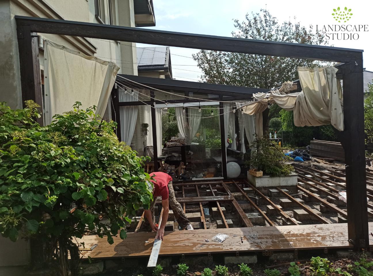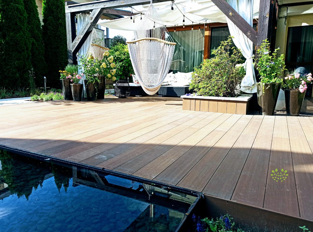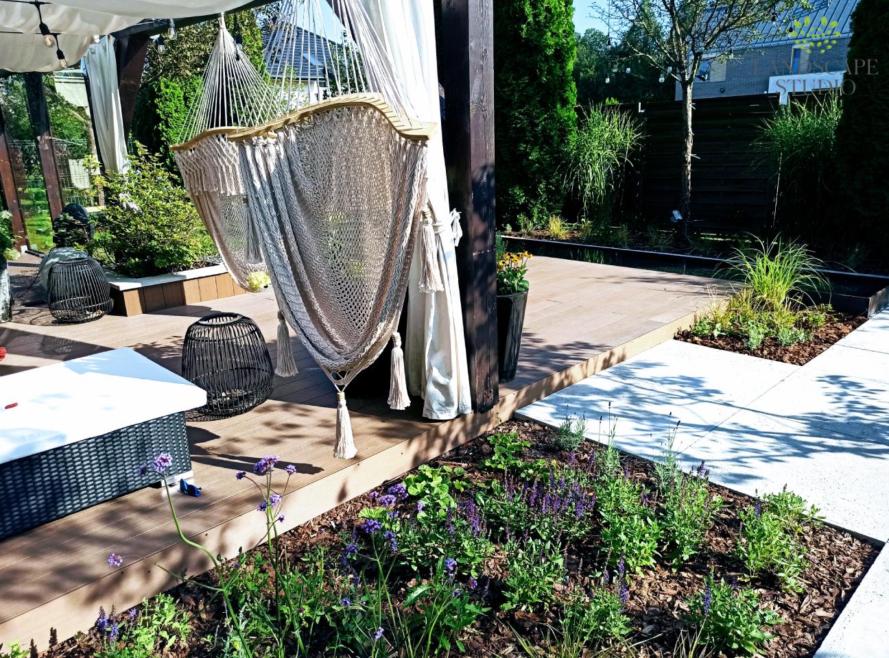 Z niewielkiej nieuporządkowanej przestrzeni stworzyliśmy strefę wypoczynku. Powstał taras z deski kompozytowej, nawierzchnia z płyt, system nawadniania i nowoczesne oświetlenie. Podwyższone rabaty i drewniane siedziska nadały trójwymiarowości. Całość dopełnia stalowy zbiornik wodny oraz dekoracyjne panele roślinnymi motywami.