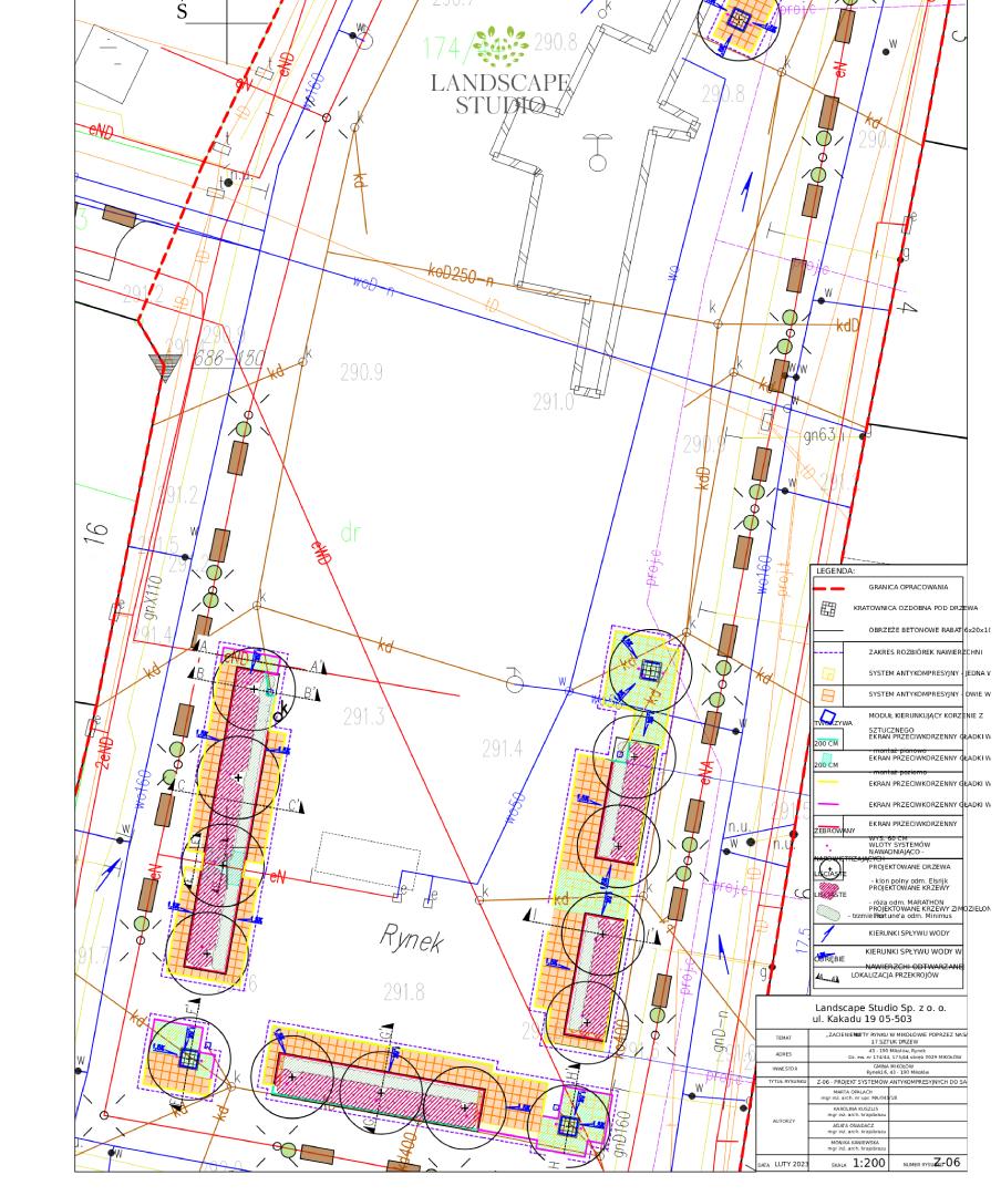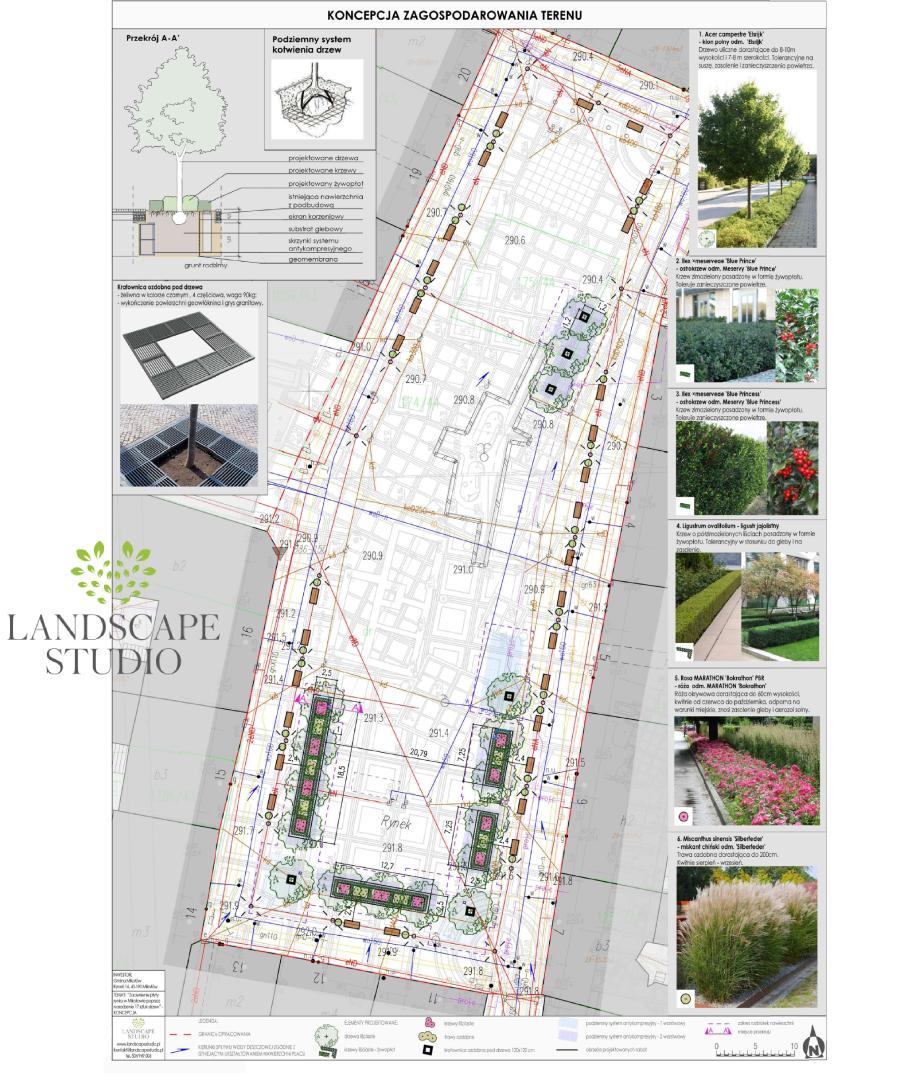 Dla ochrony infrastruktury podziemnej zastosowano systemy antykompresyjne, wspierające rozwój korzeni drzew, a ozdobne kratownice wokół skrajnych nasadzeń podkreślą estetykę miejsca. Projekt harmonijnie łączy naturalne elementy z nowoczesnymi rozwiązaniami, czyniąc rynek przestrzenią sprzyjającą zarówno mieszkańcom, jak i środowisku.