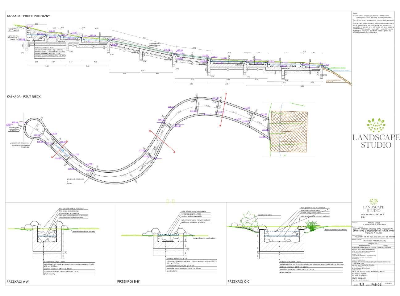 Projekt zakładał wykonanie kaskady wodnej, która miała odbierać wodę deszczową z kanalizacji deszczowej i doprowadzać ją do istniejącego stawu.