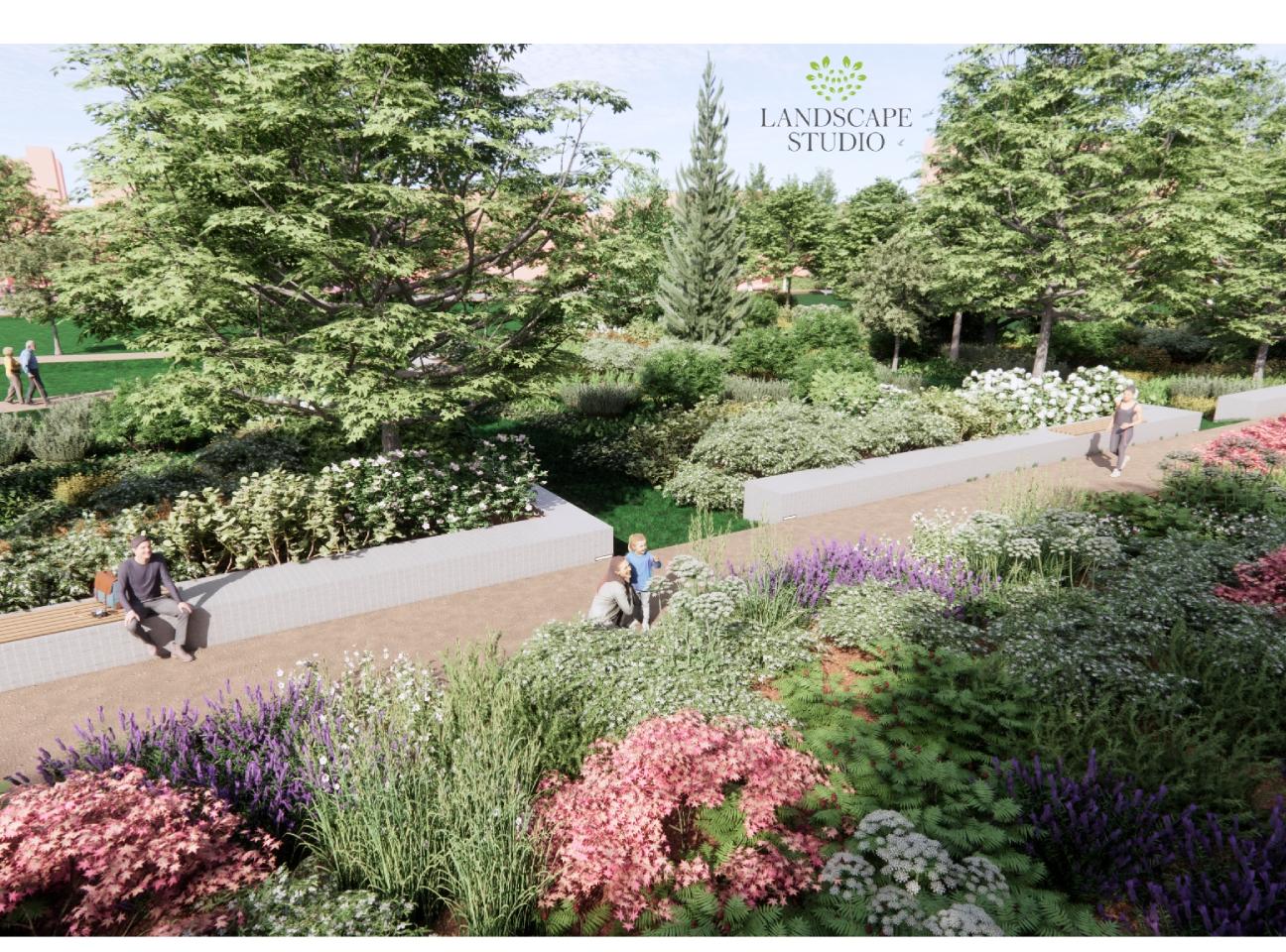 Naturalny charakter zieleni zachowano poprzez pozostawienie istniejącego drzewostanu oraz nasadzenia o charakterze naturalnych zakrzewień. Nowe nasadzenia, ze względu na ograniczenia w pracach ziemnych, zostały zrealizowane w podwyższonych rabatach z murkami gabionowymi. Wybrane drzewa wymagające wycinki zostały przycięte do poziomu gruntu.